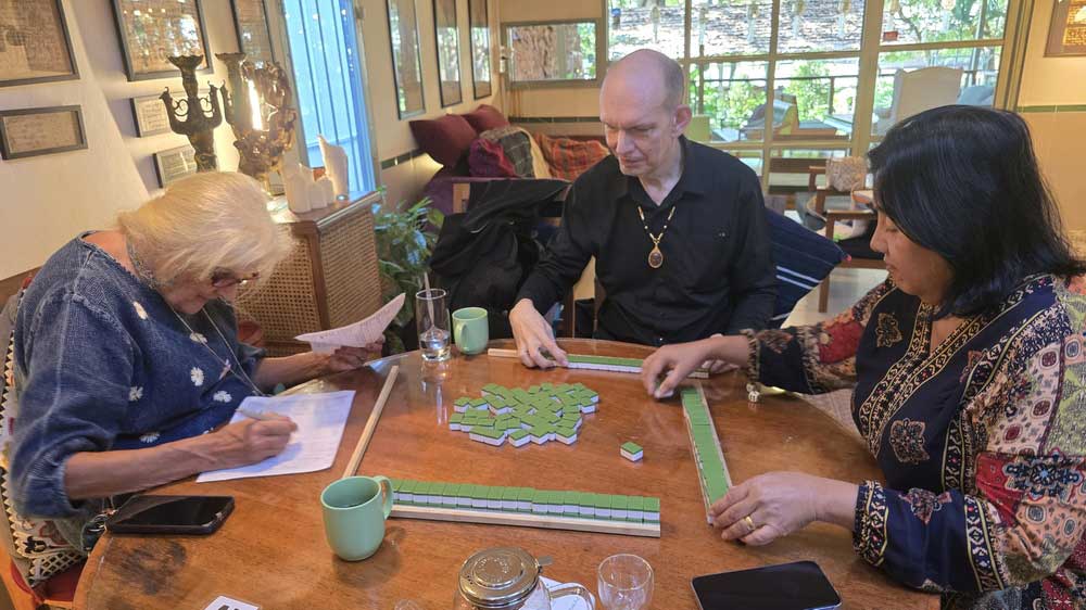 Irene und Leo übernahmen meist bereits die Vorbereitungen und bis die Kaffee-Tanten und -Onkel im Monsoon Tea Wat Ket eingetrudelt kamen, waren die Mahjong-Mauern bereits gebaut > da konnten sich alle hinsetzen und gleich mit Spielen beginnen.
